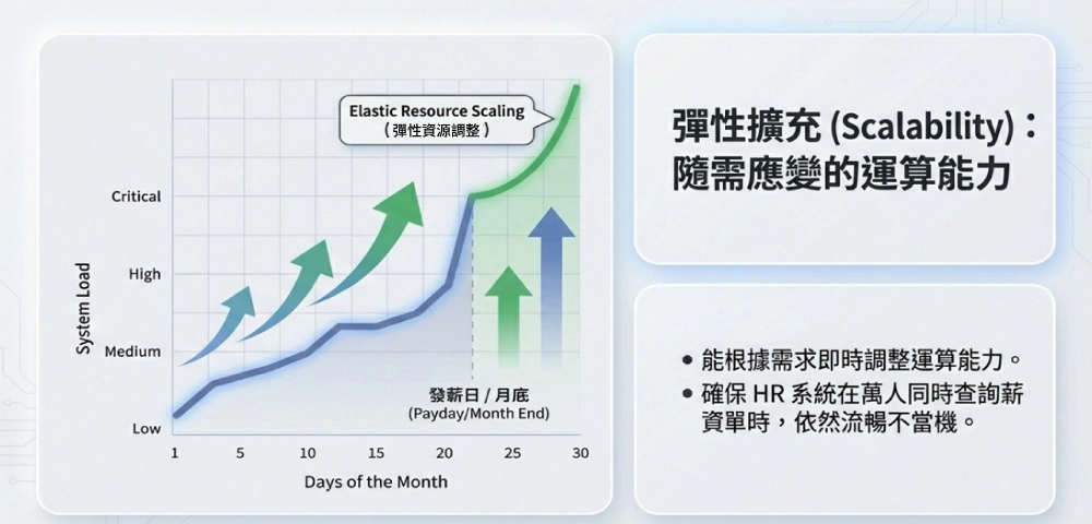 - 實質效益:雲端環境能顯著縮短大型企業萬人結薪的處理時間,確保系統在高負載下依然穩定。