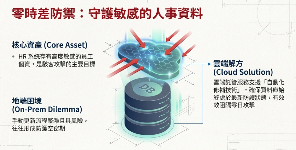 - 地端困境與風險:HR 系統存有高度敏感的員工個資,容易成為駭客攻擊目標。傳統地端手動更新流程繁雜且具風險,易形成防護空窗期。