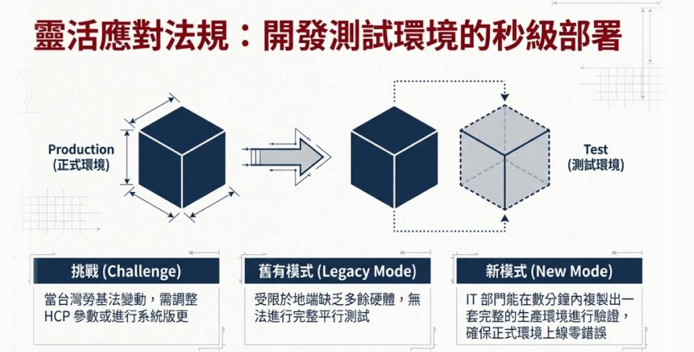 - 地端受限的合規挑戰:當台灣勞基法變動,企業需要頻繁調整 HCP 參數或進行系統版更。地端環境常受限於缺乏額外硬體資源進行測試與驗證。