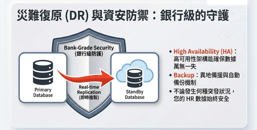 HA(High Availability;高可用性)HCP系統上雲後,可利用雲端跨可用區的特性,輕易實現地端難以企及的災難復原能力。即使發生極端天災,企業的人事數據與薪資發放亦能迅速切換至備援節點,大幅強化企業營運韌性。